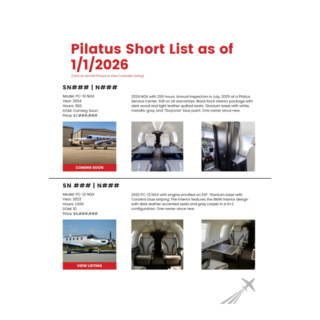 In this report for our acquisition clients, we leverage our in-depth knowledge of the Pilatus market to fine-tune your shortlist, assess each aircraft’s value, condition, and potential, and create a dynamic shortlist tailored to your specific criteria.
